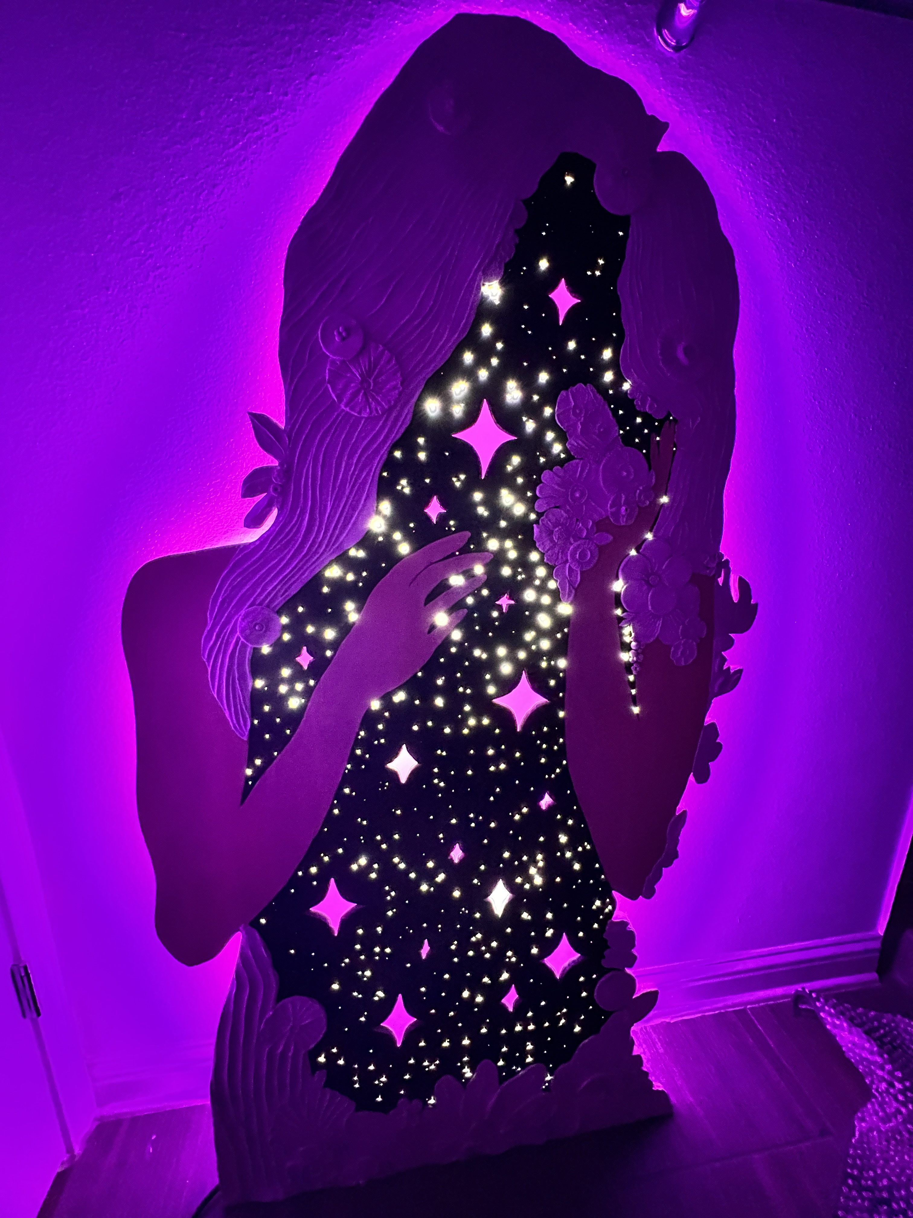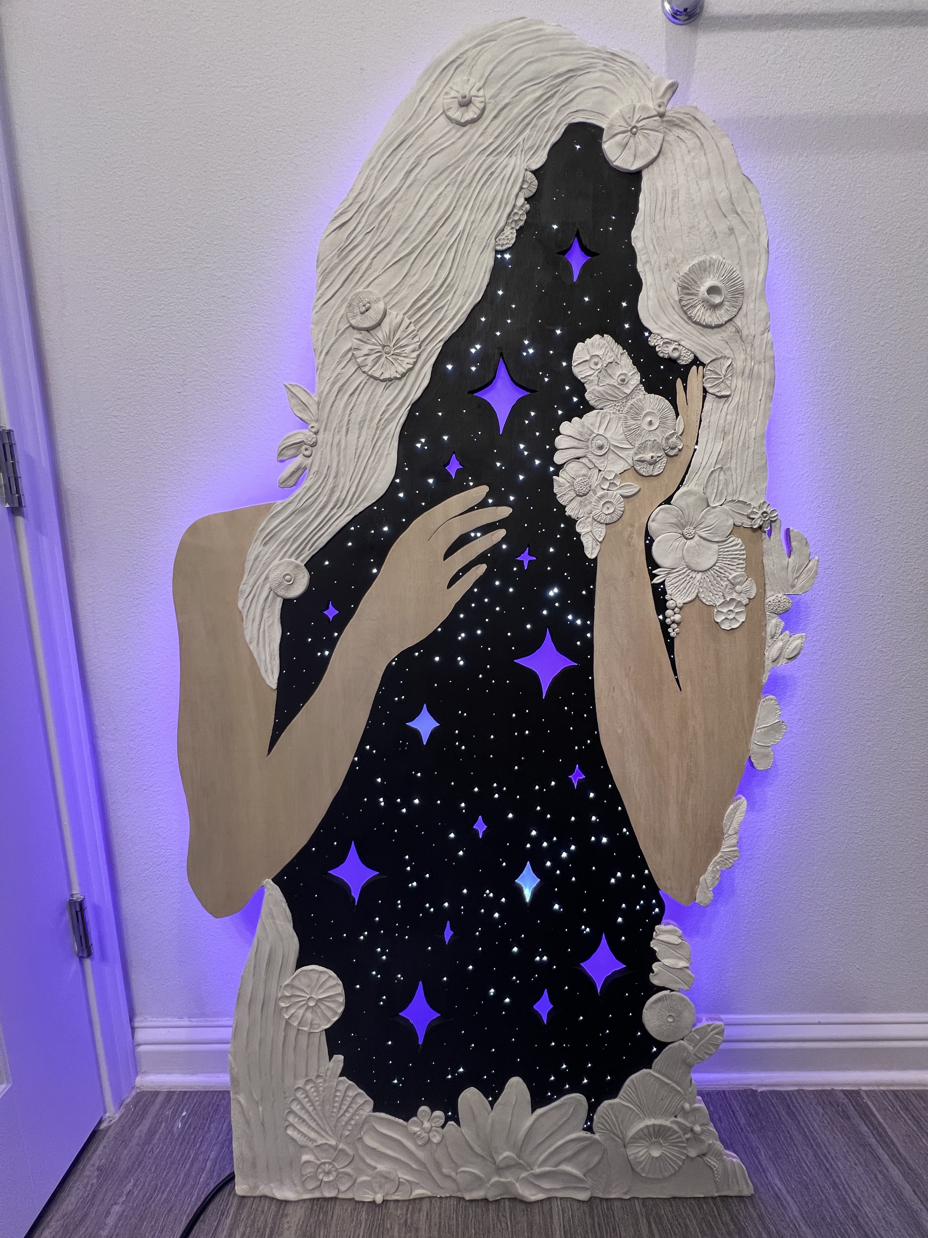 Half A World Away is made with wood, air dry clay, LED lights, and over 600 fiber optic cables. It is currently for sale and being displayed at Almost Real Things in their Touch the Art exhibit which is in collaboration with The Texas School of the Blind and Visually Impaired. All the art in this gallery can be experienced through through touch. I like to think of this creative dedicated to my friend as a wonderful way for her to still touch the hearts of others, as she always did when she was here among us.