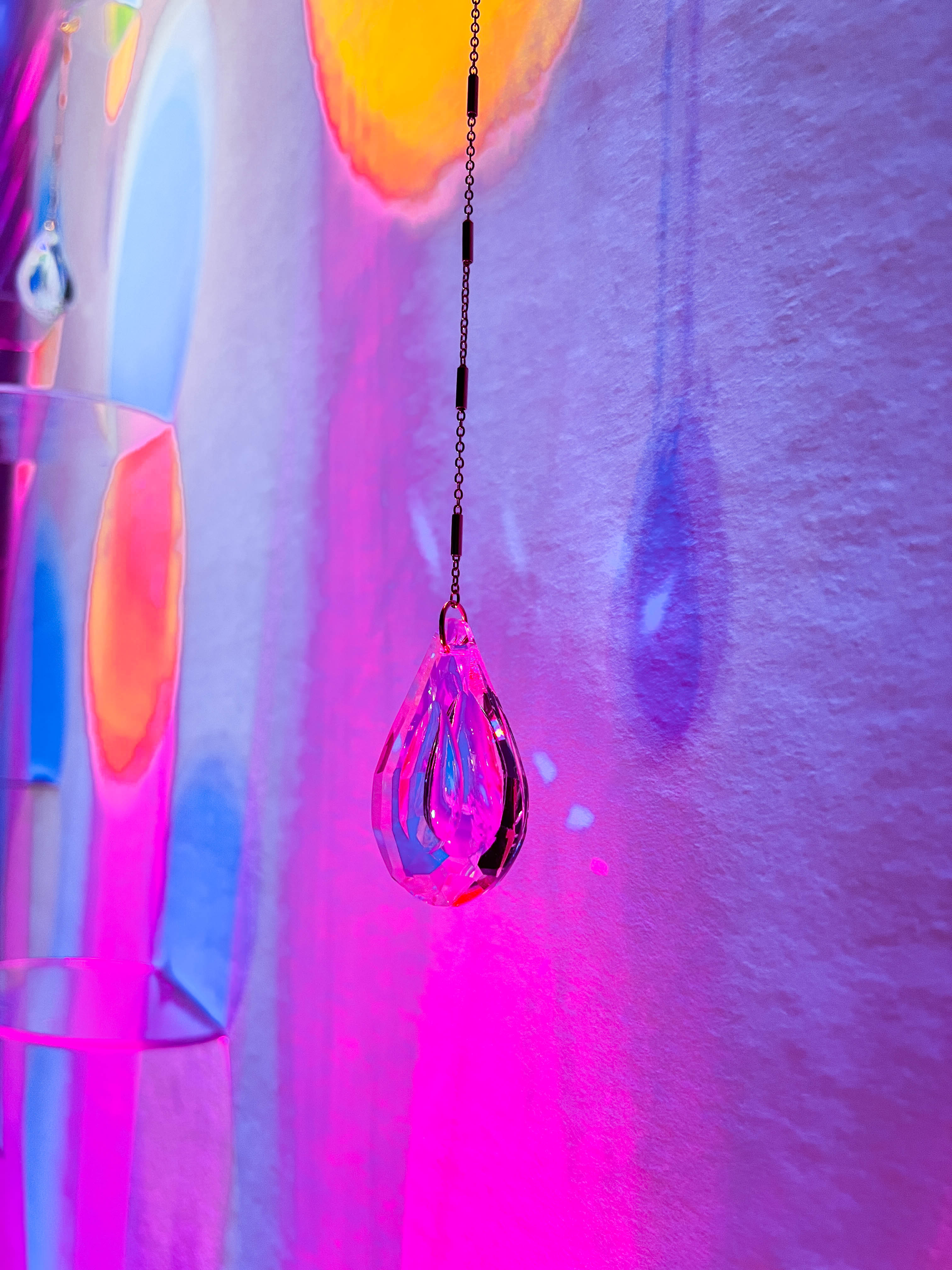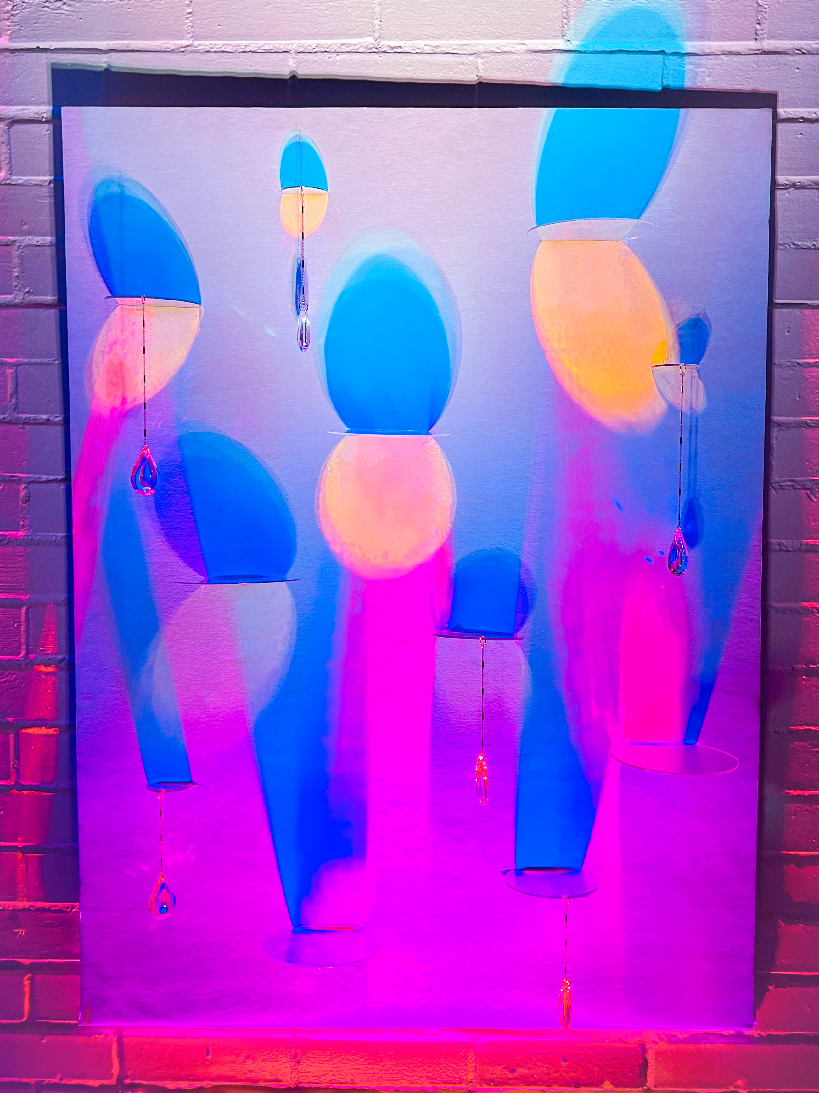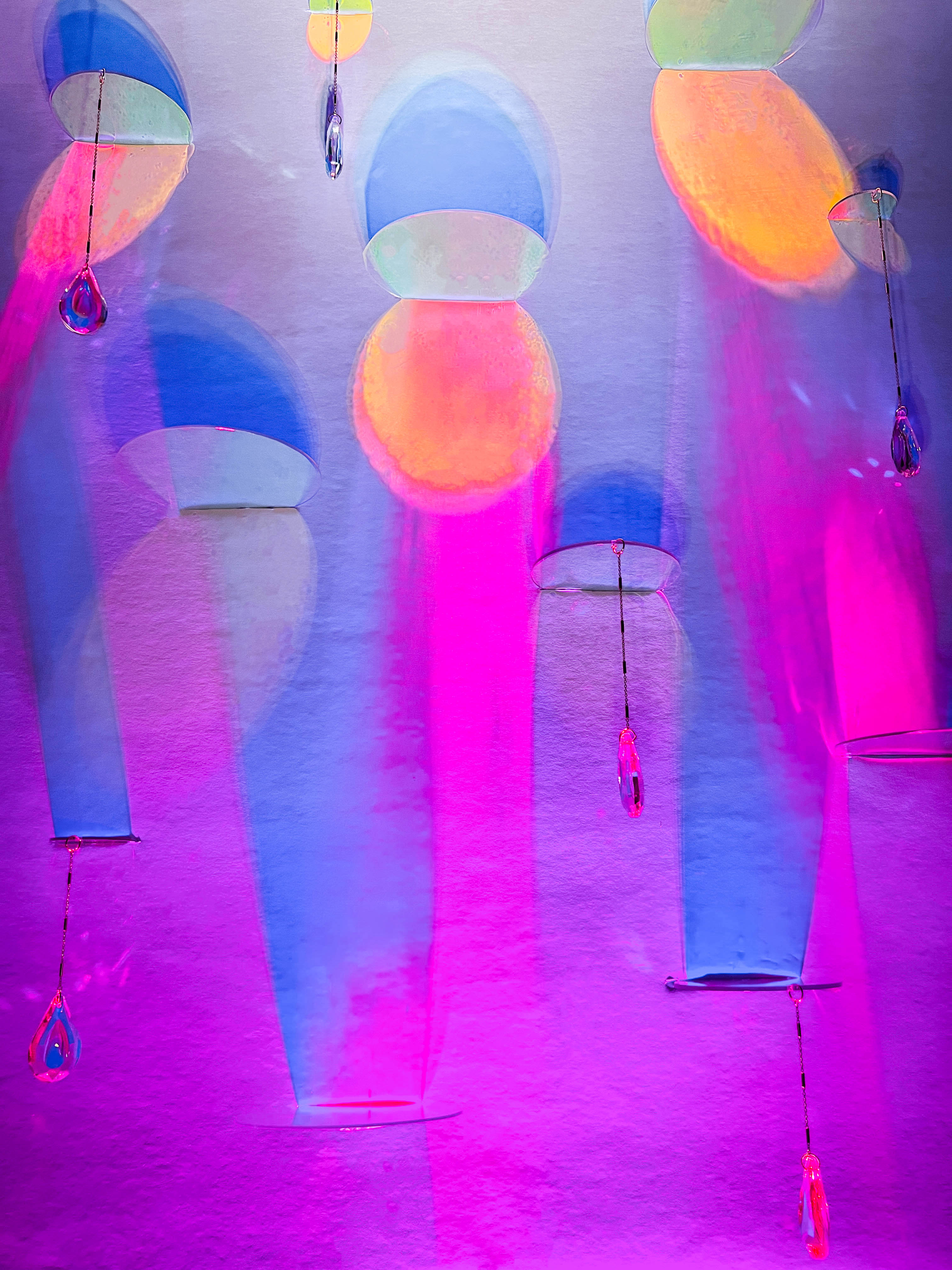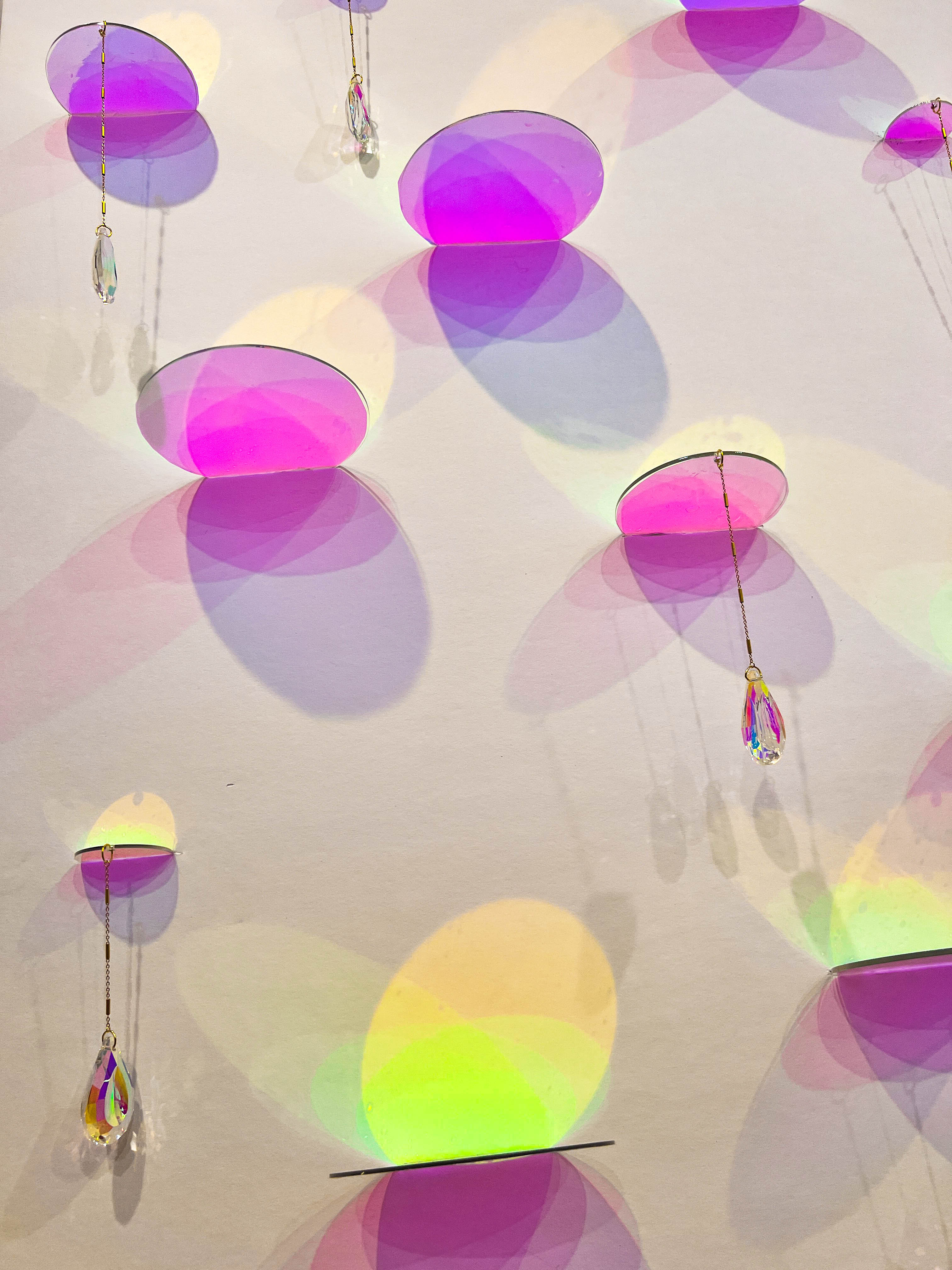 This piece was constructed with clear acrylic that was then coated with an iridescent film. High quality teardrop suncatchers hanging from intricate gold chains which were dangled in varying lengths from the acrylic lily pad-like circles. A powerful spotlight was strategically placed beneath the artwork that had different colored film to insinuate a vibrant transition through the colors of the rainbow.