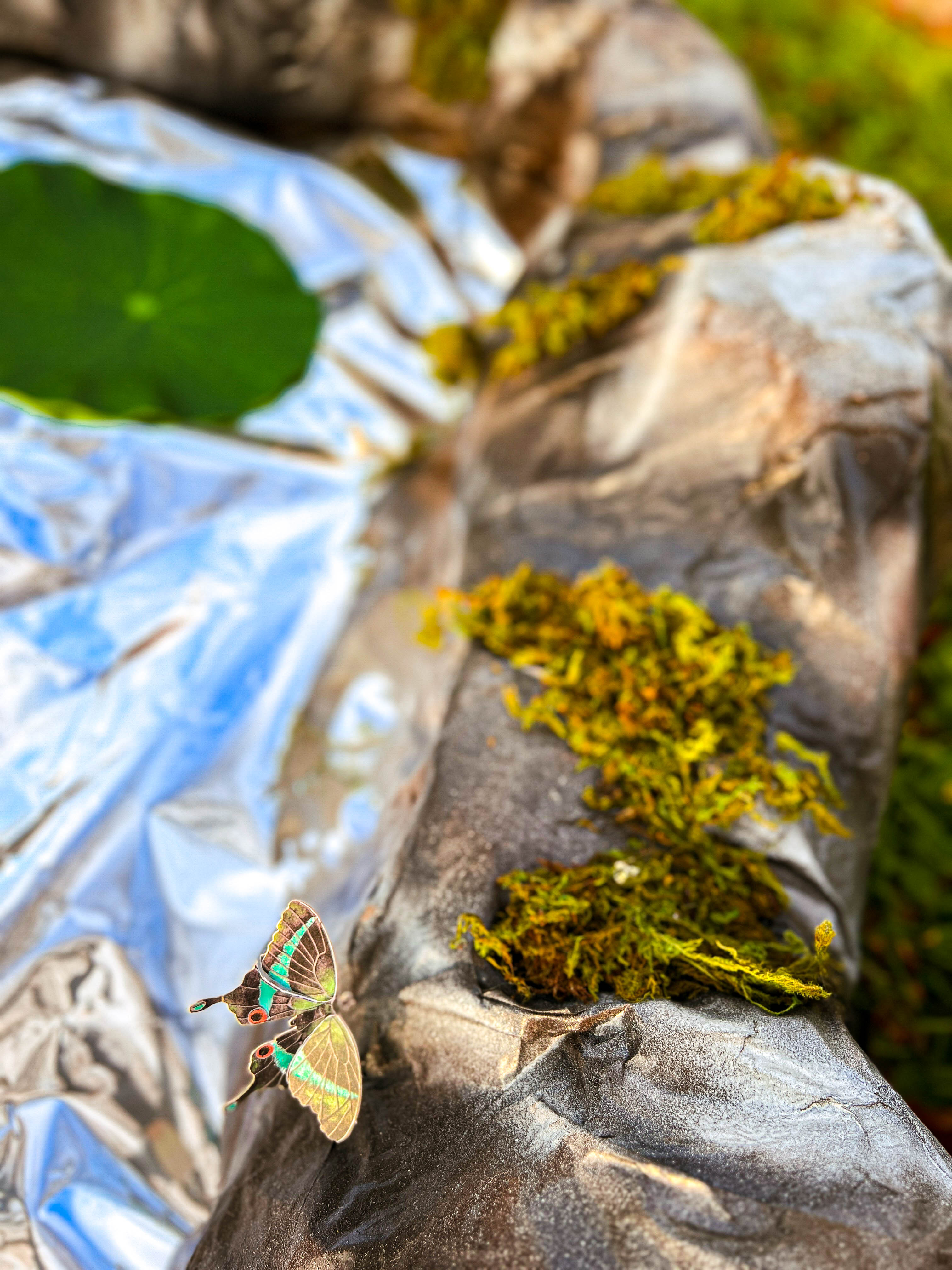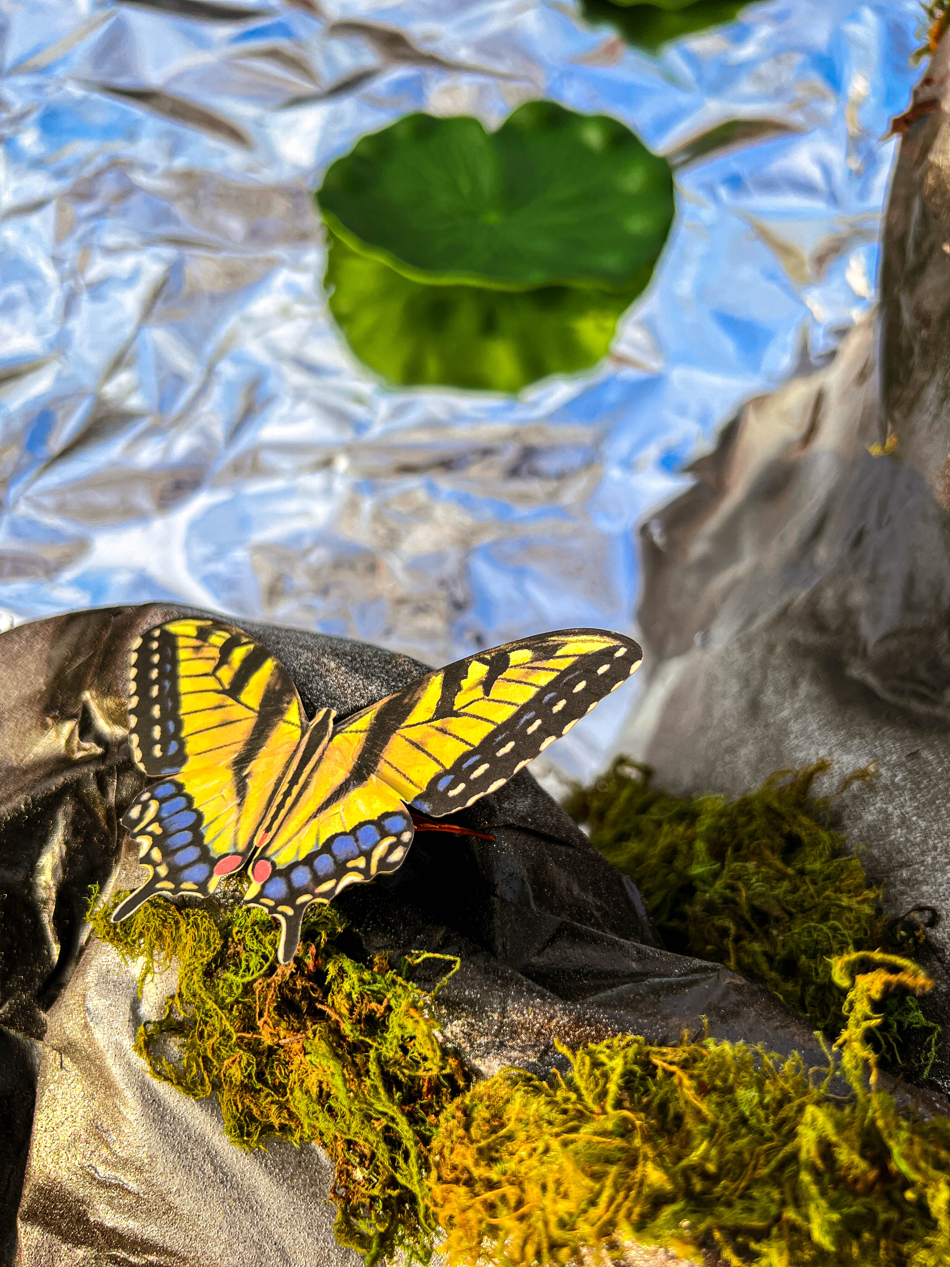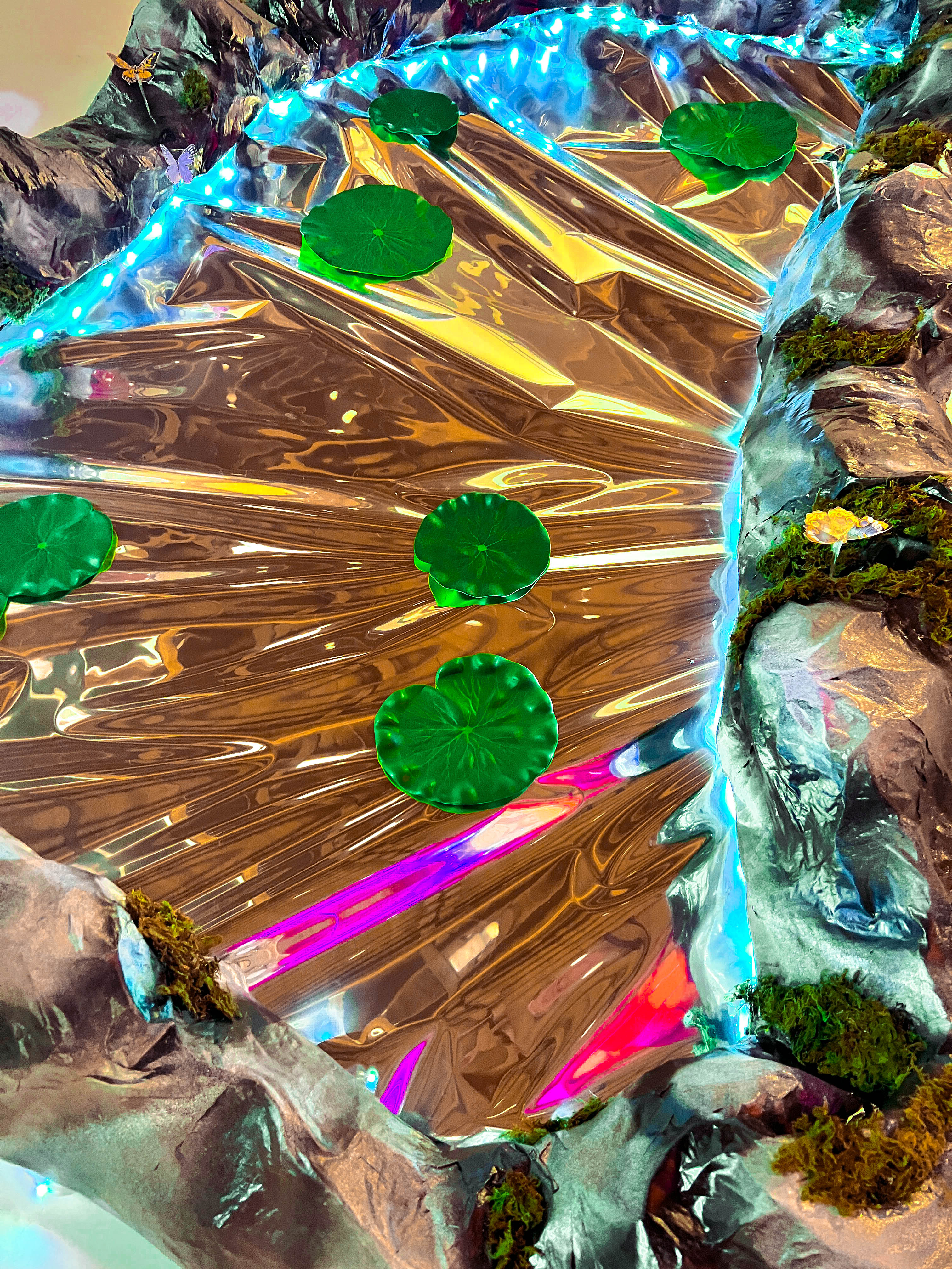 The concept for this was developed from the events theme - 'Reflections'. I built this 8' x 4.5' 'reflecting pool' by papermaching chicken wire and craft paper to sculpt the rocks, spraying the structure with different colored and textured paint, adding living moss to it, as well as 20 hand-cut, beautiful 3D butterflies. I also installed remote controlled color changing LED lights between the pond and the affixed mylar. Once the piece was installed, I then wrote instructions and a meditation prompt beside a bowl of 1,000 white flower petals for people to "make a wish" and throw it into the pond.